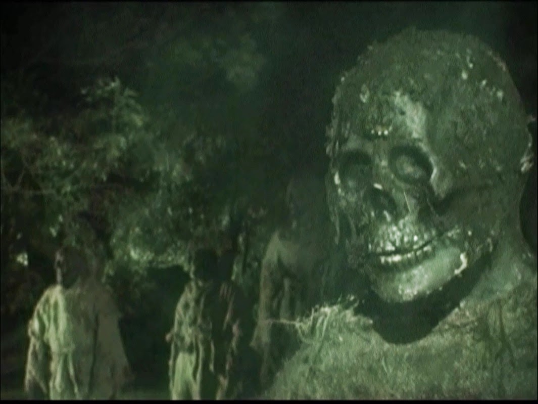 Thought that zombie busted through that window, didn’t you? Nope, it’s a separate shot of a shattered pane expertly composited onto the empty frame with the undead’s arm plunging through! That gooey Eraserhead-lite baby puppet? Never on the same set as the lovely ladies it viciously attacks! Those skulls surrounding the archeological dig? All added in post!