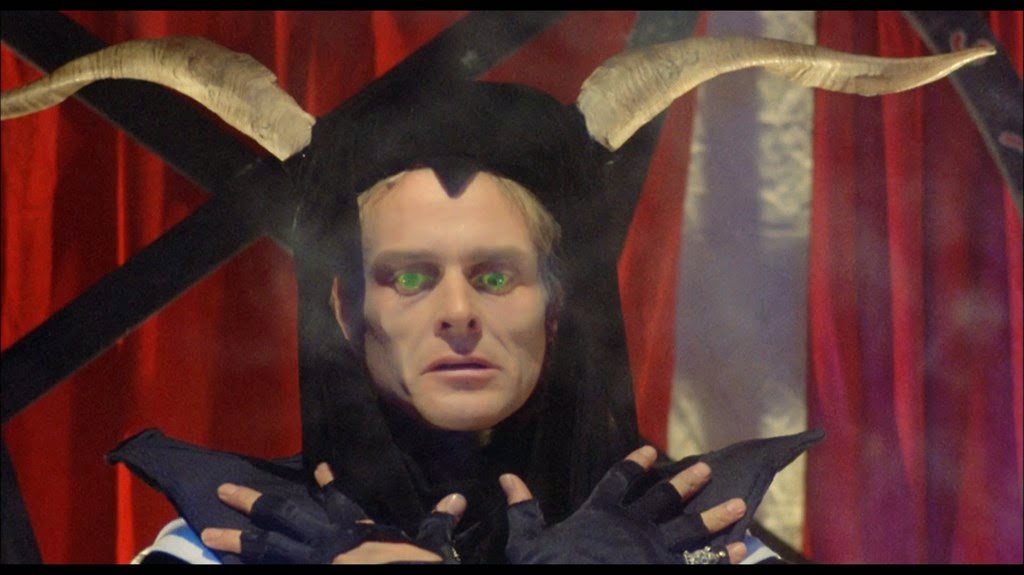 The performances are strictly of the B-movie ilk, with Liapis calling to mind a scenery-chewing Kyle MacLachlan, yet his occult-chanting histrionics are no match for Des Barres’ strutting, snarling villainy or Jack Nance’s thoroughbred weirdness. (The David Lynch mainstay has a reduced but significant part as Graves’ groundskeeper and pseudo-guardian Wolfgang.) Pelikan, whom well-versed aficionados might recognize from her snake-charming turn in 1978’s Carrie-esque Jennifer, does what she can with an underwritten role, drifting between distressed damsel and short-tempered shrew. Little people performers Peter Risch and Tamara De Treaux play both sides of the antagonist fence, at first beholding to Liapis before bending to Des Barres’ superior might.